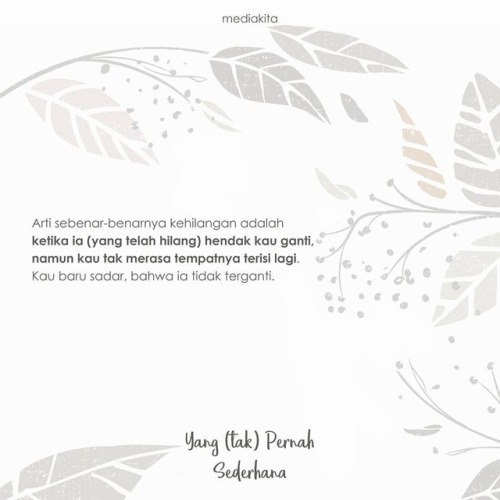 Mungkin ia bisa kau lepaskan, lalu kau cari penggantinya. Namun tidak semua hal bisa kau gantikan. Kehilangan dan seseorang yang baru, tidak sesederhana itu.
