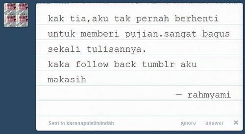 Hey Tia! Seriously you're an engineer? Dari ITB ya kalau tidak salah? Wah gak nyangka banget deh :)) Engineer yang biasanya kaku, penuh dengan logika dan perhitungan rumus bisa membuat dan menuangkan kalimat dengan begitu indahnya :) Terus berkarya ya! Oh
