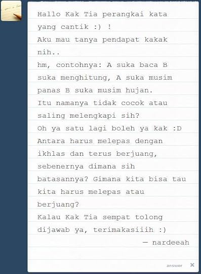 Menurutku, ketidakcocokan terkadang bukan datang dari sebuah atau beberapa perbedaan, namun lebih pada ketidakikhlasan untuk menerima kekurangan. Beberapa orang menganggap sebuah perbedaan selera sebagai suatu kekurangan. Padahal, seharusnya tidak, kan?