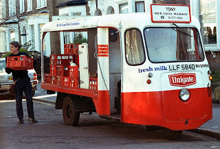 This seems to have that special power to cause sparks in people's minds and to unlock memories. I think we must all have been there. Stepping out into the street in the relative hush of the early morning. In this case there is activity - hence the haze caused by commuter traffic fumes, perhaps a low level hum - but there is an absence of sound clutter. The stillness is very apparent to us. Then, all of a sudden in this void there is a sharp sound. Not loud, but very noticeable. It is immediately recognisable as the chink of two bottles as they bang together. Our imagination lights up. We picture a milkman, perhaps, walking hurriedly from his milk-float (cart / van) to a terrace of houses, carrying a rack containing six cold, white bottles covered in condensation. The curtains in the houses are still drawn. A cat sitting on the step of number 8 darts out of the milkman's way. He is whistling a happy tune as he steps across a low fence to the next house. He'll be in trouble if he's seen. He has been asked by the lady at number 10 not to do that. Her mesembryanthemums are getting damaged. Why don't Blue Tits peck the tops off milk bottles to drink the cream anymore? Why doesn't milk taste like it used to? Why did granddad's porridge always taste better than your mum's and who was that boy you knew who used to faint at the breakfast table and once fell face first into his bowl of cornflakes?