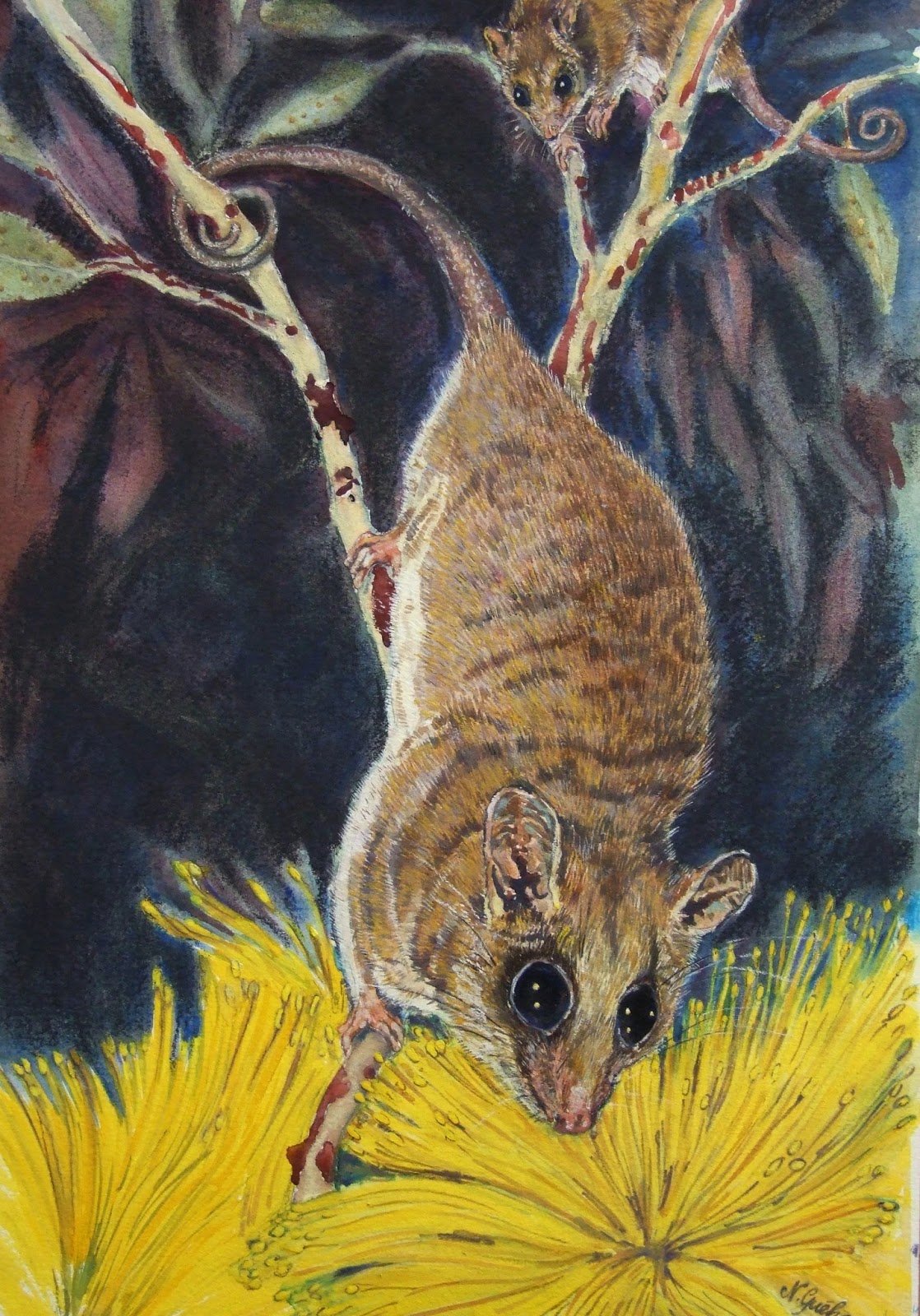 Small striped Honey Possums (Tarsipes rostratus) or Noolbenger, are half the weight of a mouse. They are not really possums but the only surviving member of a long extinct marsupial group. Honey possums are relatively common and found in heathland and banksia woodlands and are nectivores which means they are specialized to feed almost exclusively on flower nectar and pollen. They are probably very important pollinators of heath plants, the marsupial equivalent of a honeyeater as they have only residual teeth and a long brush tipped tongue for probing flowers. I have seen them at night by spotlight on B. speciosa.