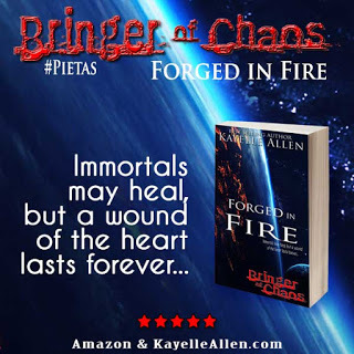 Genre: science fiction, sci fi, scifi romance, action adventure, space opera, military science fictionASIN B077BRSRP4ISBN 1981328327Released: Dec 27, 2017Publisher: Romance Lives Forever BooksPages: 236Print pages: 297Wordcount: 75,831Suggested keywords:Kayelle Allen, Bringer of Chaos: Forged in Fire, science fiction romance, immortals, Pietas, sci fi, space operaSuggested hashtags:#SciFi #SpaceOpera #PietasBuy Links: Amazon https://amzn.to/2pzB0DvAmazon UK https://www.amazon.co.uk/dp/B077BRSRP4Amazon CA https://www.amazon.ca/dp/B077BRSRP4Amazon AU https://www.amazon.com.au/dp/B077BRSRP4