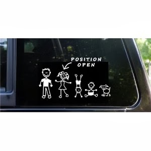 Mommy stick figure has a swollen belly and dark circles under her eyes from trying to work, get the kids to school, and still have time for daddy. She stares absently ahead from lack of sleep.Daddy stick figure comes with a remote control in one hand and a beer in the other. Kiddie stick figures are armed with Smart Phones and Ipods, and they sit on the other side of the windshield, ignoring everybody.Doggy stick figure begs for food while trying to mount the family stick figure cat.