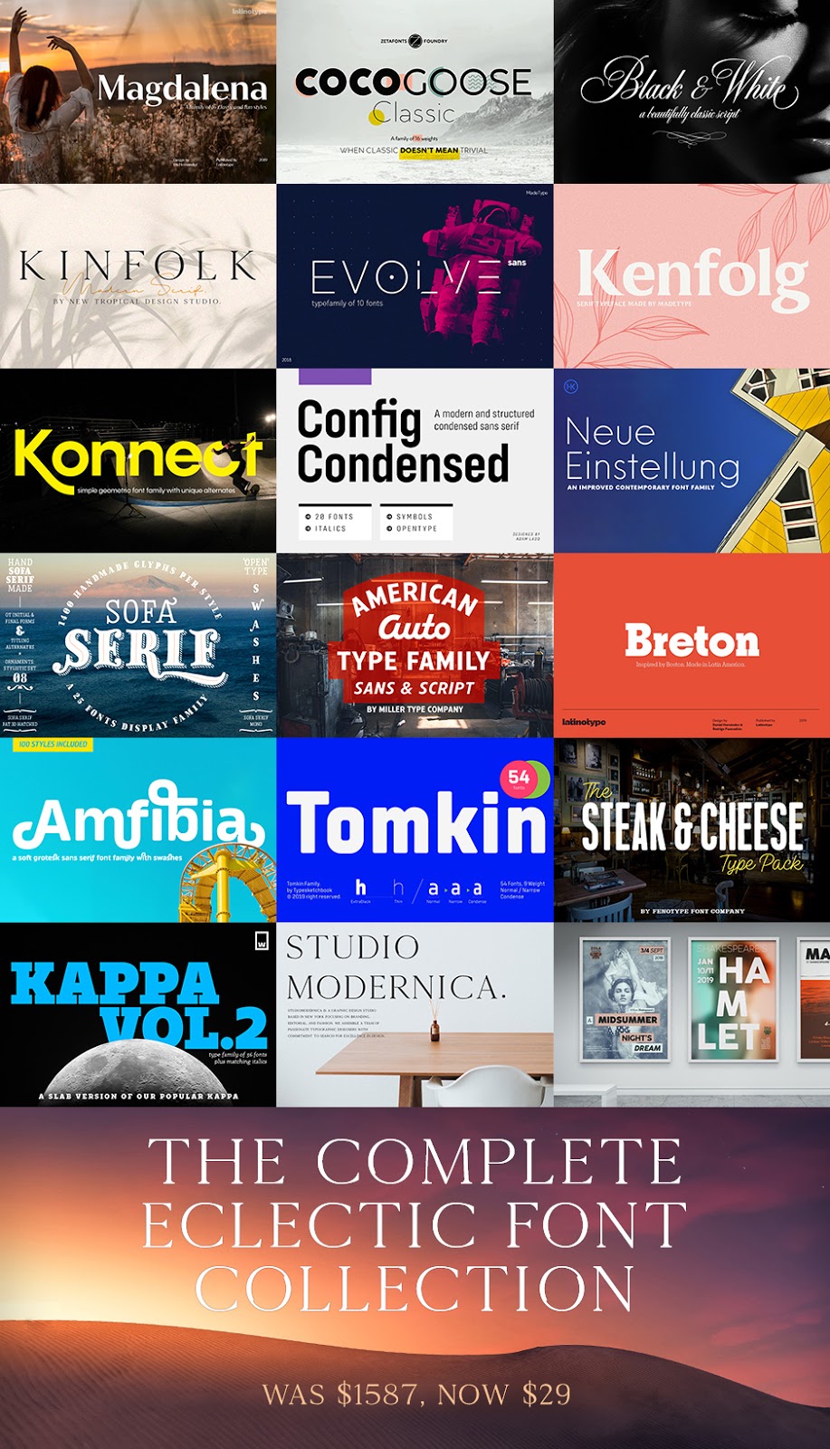 Add Eclectic Flair To Your Design Work With These Stunning, Popular FontsFonts continue to top the list as one of our most requested products and it is easy to understand why! They can play a crucial part in making your design work stand out from your competition. Finding the right font with the right licensing though can be a total time drain – which is why we have put together this eclectic collection to ensure you have the perfect font for every design project for years to come.Available for a limited time only at a staggering 98% off the original price.