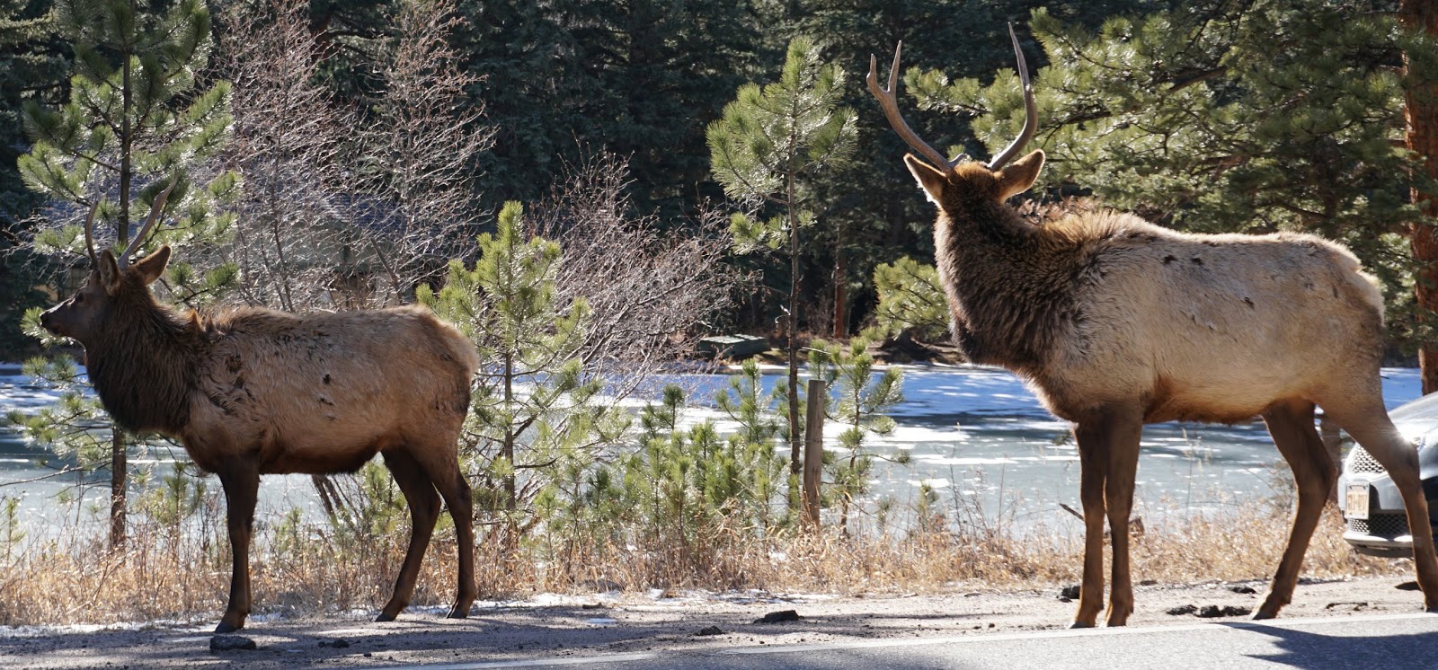 Driving into town, Charlotte saw two elk.