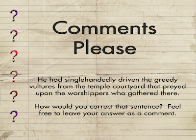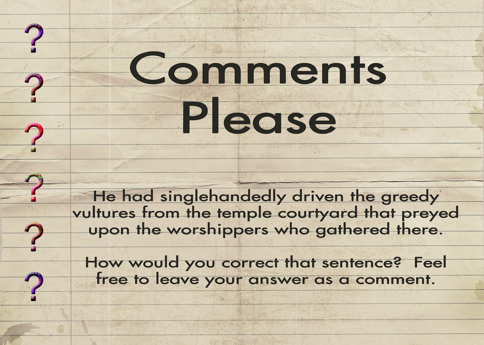 He had singlehandedly driven the greedy vultures from the temple courtyard that preyed upon the worshippers who gathered there.How would you correct that sentence? Feel free to leave your answer as a comment. L.A. loves comments, and so do I.
