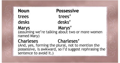 Did you take note of the last example? That’s one of the most common errors I find. Charles is a singular noun, and the rule of adding an apostrophe and an s applies to it. I grind my teeth every time I read Charles’, which is why I fought and won an argument with one of my editors who hadn’t learned the rule and changed all my Charles’s to Charles’. I no longer write for that publisher, but that’s another story.
