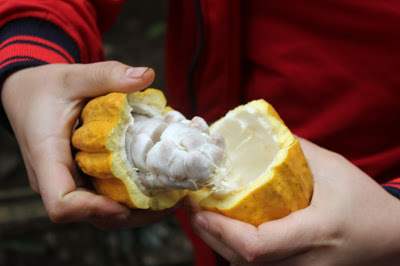 These are cacao pods hanging from the tree in varying degrees of ripeness. They're really quite beautiful. The rare white bean's pod isn't white, by the way.