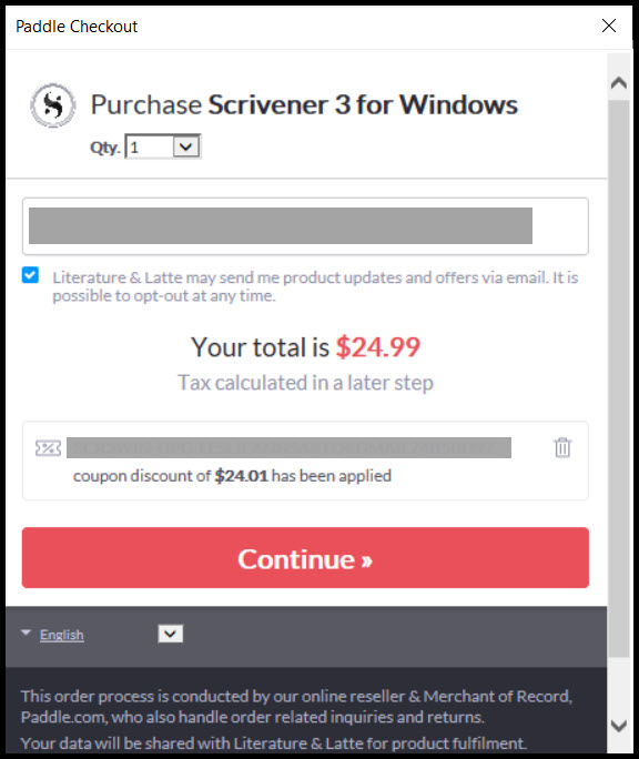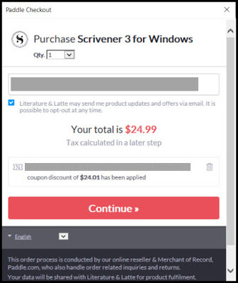 I hit the continue button and I taken to my choice of payment. I paid and within a minute or two my Scrivener 3 for Windows was activated.