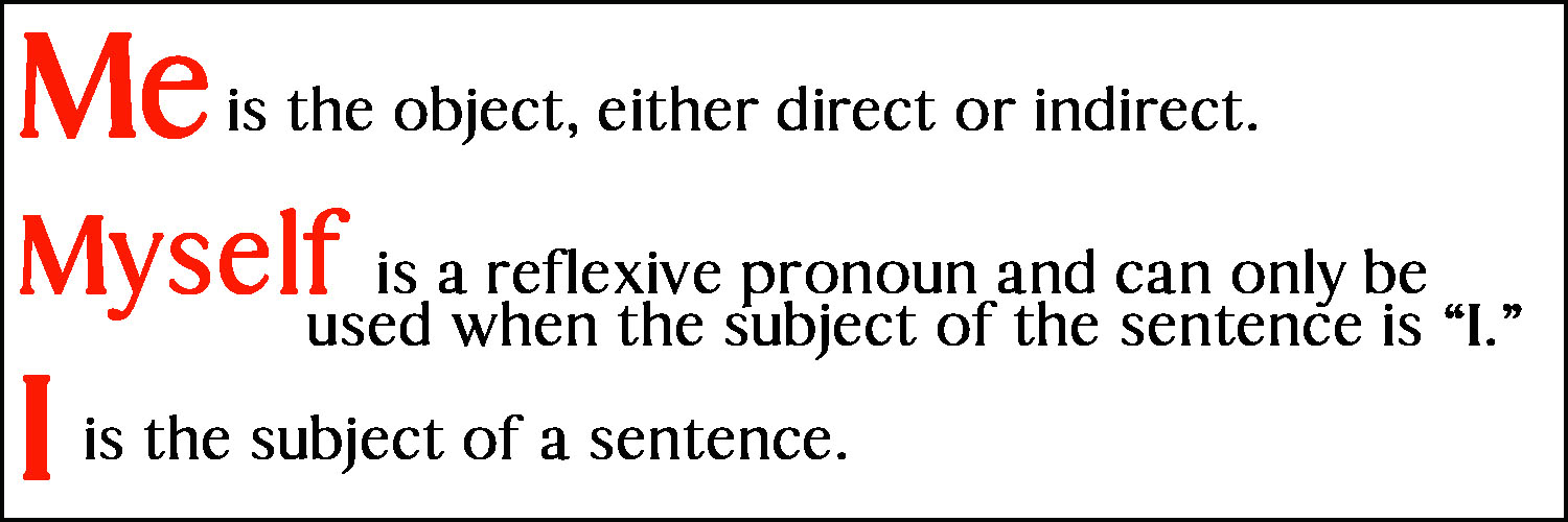 Me, myself, and I. The rules are simple. · “I” is the subject of a sentence.· “Me” is the object, either direct or indirect.· “Myself” is a reflexive pronoun and can only be used when the subject of the sentence is “I.”