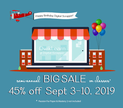 Digital Scrapper | QwikLearn Semi-annual BIG Sale Sept 3 - Sept 10, 2019, Midnight Eastern SAVE 45% off Classes (excludes Mastery 2 & Passion For Paper)Questions? Email info@DigitalScrapper.com