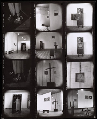 Contact sheet showing images of Wallace Berman's exhibition at the Ferus Gallery in Los Angeles, 1957. The Getty Research Institute, Charles Brittin papers, 2005.M.11.13. © J. Paul Getty Trust. Photos by Charles Brittin