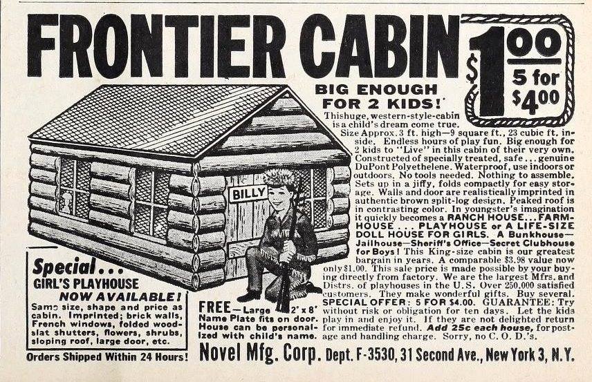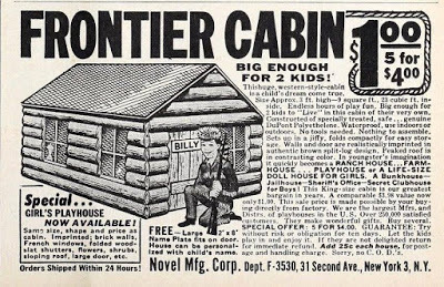 Thanks to Gregory Fullerton for finding the original ad that suckered me (and my dad) into buying a log cabin when I was a very small boy. I wrote about it in my memoir "TOSH: Growing up In Wallace Berman's World" (City Lights). Even looking at it now, I still want to send $1 to this company for their log cabin. One of the first times in my life where I came to terms with the word 'disappointment.' - Tosh Berman