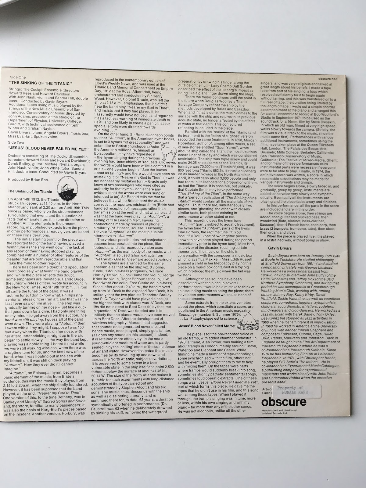 I went to Rockaway Records this week, and I purchased two albums: the late Ronald Kane owned Gavin Bryars' "The Sinking of the Titanic" (Obscure Records) and "The Joe Meek Story" (Decca). I know this is true because there are stickers on both albums that says “The Property of Ronald Kane.” One on the back cover, and another on the record label itself. I may have met Ron Kane when I worked at Licorice Pizza music store chain during the 1980s. He was the import record buyer for the entire chain, and it’s considerably possible that I met him perhaps at a Christmas party for the store, or when we had to get together for work meetings. Then again I worked at the West Los Angeles and Reseda stores, so, for instance, I never went to their Glendale headquarters. At least, I have no memory of going to the main offices. That would be where Ron Kane worked, and now, I only know of him due that he passed away not that long ago.