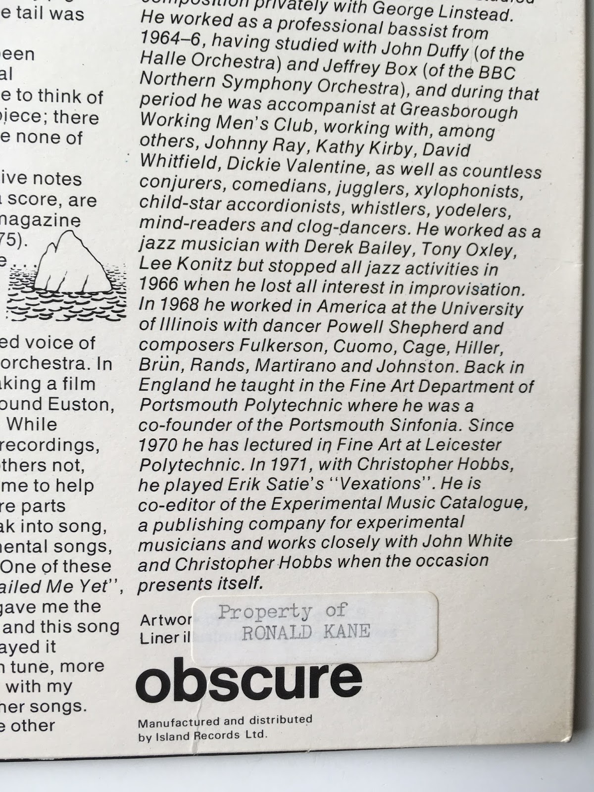 I’m not the most excellent collector in the world, but I suspect Ronald Kane was one, in that he spent his life being intensely focused on the issues of records and where they came from. The vinyl albums here in the store are all new looking. Nothing tattered or torn, and every piece of vinyl, when I open the package seems in perfect shape. The only alteration is the sticker with his name and that he owns the object on hand. I often wonder why people put their names on albums. For one, you can presume that they loan out to friends or institutions, and they want to make sure that they get their record back. Or, the essence of owning an object, you want to make sure there is some physical sense of ownership of that object. Signing one’s name to an object or a collection is very much the same as an artist who signs their own artwork.