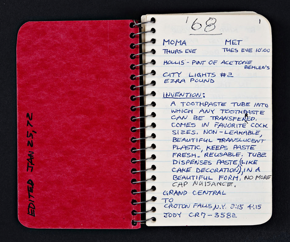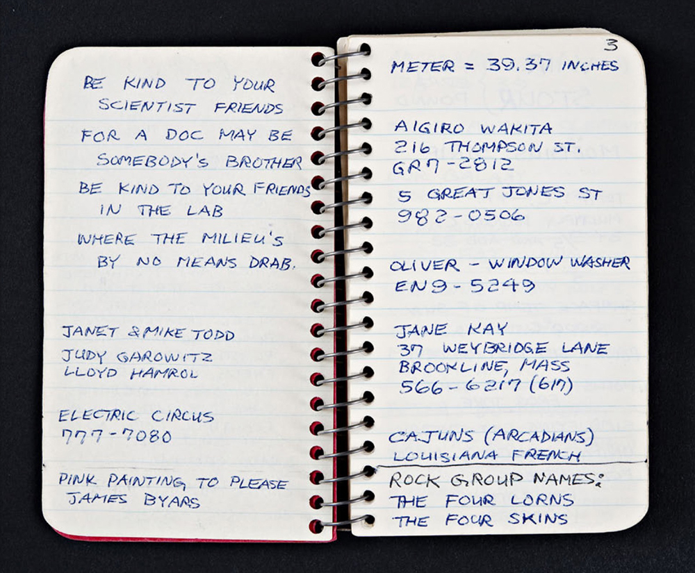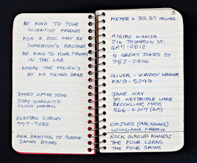 "Book 1" is a small memo lined notebook, and due to size it's very intimate, but also the writing/notes with her handwriting, is witty - and very personal. "Abortionist John Adams" and then his phone number and a note that "Dr. Spencer's recommendation." From one page to the next, it seems Lozano's brain didn't stop. Her appreciation or acknowledging the drugs of that time and period (1968-1969) as well as her listening habits (Pink Floyd) and views on fellow artist friends such as Dan Graham, is a combination of horrific, charming, and such a great document of New York City art Soho life.