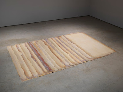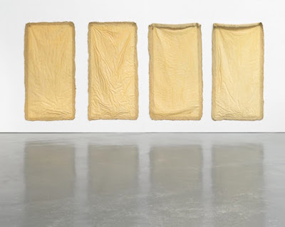 “Augment” is a funny title for the other piece that is in the exhibition. It’s layers of latex canvases that are laid on the floor on top of each other. It’s a beautiful piece of sculpture, but it reads like a painting to me. I think due to its flatness, but it is 17 units or individual pieces that make up “Augment.” I don’t see this work as a passage of time, or dealing with decay -but more of a design that is somewhat hypnotic, and for some odd (unexplained) reason reminds me of layers of bacon on a plate. And although I do not eat bacon, I think the bacon itself is a beautiful looking meat. Yet, it’s the repetition of the pieces that give it a funny aspect, where one approaches this work as almost like slices of a whole bread loaf. There is a natural or environmental aspect of the work, but I don’t feel that is the intention. I think it’s more of the fact that it exists, and that is the sole purpose of this work. Seeing layers of the same thing is kind of funny in an absurd manner. I read an interview with Hesse, that is in the “October Files” series, where she mentioned that repetition in her work is - “Because it exaggerates. If something is meaningful, maybe it’s more meaningful said ten times. It’s not just an aesthetic choice. If something is absurd, it’s much more really exaggerated, absurd, if it’s repeated.” So, “Augment” works in that absurdity, but it is also a pleasure for the eye. It relaxes me, and perhaps it the repetition of seeing the same object over and over again, that gives me such contentment. “Augment” and “Aught” are separate works, but they are also a brother and sister or two sisters - nevertheless, it’s in the same family. It was shown together only once in 1968, and this is the first time in 48 years that these two pieces have been rejoined, for this specific exhibition at Hauser, Wirth & Schimmel. Artworks in a room tend to have a dialogue between themselves, and if you look, one can make connections between the two pieces. “Aught” can mean ought, which suggests a sense of duty or responsibility. “Augment” is making something greater, by adding to it. So “Aught is four individual pieces hanging on the wall, and then finally on the ground you get 17 pieces which make up “Augment.” The visual and word pun is Duchampian in a sense, but it also plays with the concept that ‘more is better than less.’