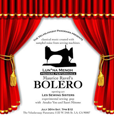 Lun*na Menoh conducting her own version of Maurice Ravel's BOLERO. All sounds from the sewing machine. What she has done is take Ravel's masterpiece back to the Industrial Age, when the sewing machine first started to appear in people's homes. Probably the first mechanic machine that appeared in the everyday home. Ravel's dad worked in a factory, so he was aware of the rhythms of the factory, and then therefore "Bolero."