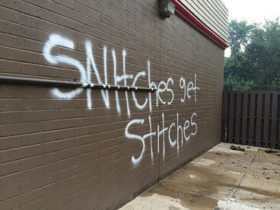The dogs were all the same species. Perhaps a pit-bull. The only thing I could make out is that their eyes were bright red, and I didn't see a pupil - but solid red eyes. It was a disturbing sight, so again, I went back to my bed. Occasionally I could hear what sounded like a dog leaping up to my window which was street level. I tried to fall asleep but the sound of the dog hitting the window pane unexpectedly, was disconcerting for me. I was feeling cautious and I didn't want to make any waves, especially living in this neighborhood. I remember I had to call the police regarding noise-making in the middle-of-the-night, and after that someone painted on my garage wall "snitches get stitches." After that I hesitate to call the police. It was much later I found out that it was actually the police that painted that phrase on my home.
