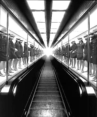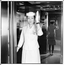 "Elevator girls at Takashimaya Department Store" would announce each floor in a high -pitched accent with an ultra feminine voice. Announcing the goods on each floor, one is in a sense getting a floor show at a supper club, but alas, it is in an elevator. The perfect choreographed gestures of using their white gloved hands to express what is on each floor and also to announce the upcoming floor number. One is not encouraged to talk to them. It would be like talking to an actor on stage as he or she is performing.
