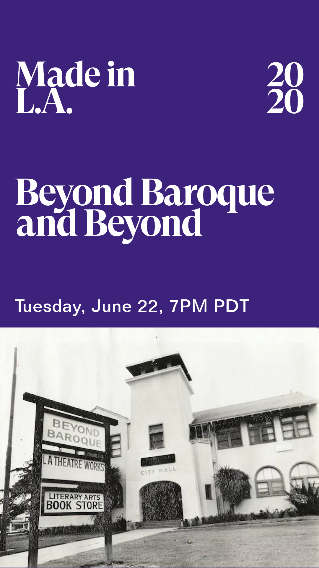 Tosh Berman interviews Dennis Cooper, Amy Gerstler, and Benjamin Weissman regarding their work and times with Beyond Baroque Literary Arts Center. It's unusual to have three of the people on the same platform discussing their times as the curator or literary 'gods! This discussion is due to Sabrina Tarasoff's Beyond Baroque exhibiton at The Huntington, in conjunction with the Hammer Museum's Made in L.A. 2020.