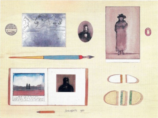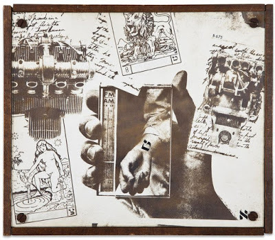 I'm intrigued with his works on wood, mainly through the medium of ink, collage, paint, and pencil. One, Dry Point Table (Illustration above), he gives equal space to each image. It reminds me of Marcel Duchamp's Box in a Valise, which is his entire works put in a suitcase. In a series of works on wood, which resembles looking at a tabletop, Steinberg is not complete, but there are personal items that are placed neatly. The viewer can connect the pen, the portraits, and an image of a book opened to Steinberg's art.