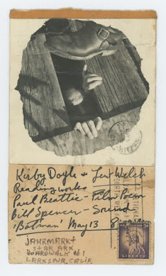 A handmade mail art collage announcement made by Berman for an event at Billy Jahrmarkt’s Batman Gallery, which featured Lew Welch and Kirby Doyle reading, as well as a film or performance by Paul Beattie and Bill Spencer. The postcard is illustrated with a pasted down photograph by Wallace Berman, which features Lew Welch peering out from beneath a hole in a dock or floorboards, with the large leatherbooted foot of Kirby Doyle poised above his fingers. The image appears on p. 61 of Wallace Berman: Photographs.