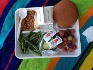 M’s tray with whole-wheat hamburger bun, burger, beans, cucumbers, grapes and green beans
