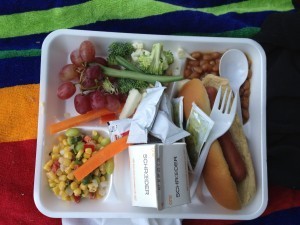 my tray with hot dog and whole wheat bun, corn and edamame salad, broccoli and cauliflower, grapes, carrots