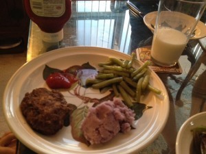 When she put them on the plate, she then covered them in ketchup (I will spare you that photo…) and we all thought they were a little more pasty than our usual mashed potatoes, then Dad wondered if we added more evaporated milk if they would taste just like the others… (That night we had green beans and risoles, an English type of meatloaf patty. Yummo!)
