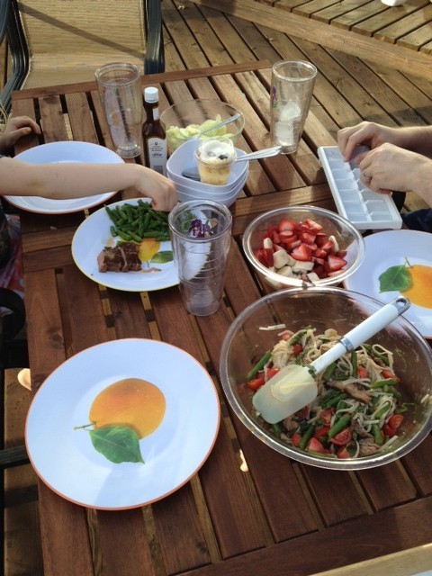 So, the table looked like above. The mixed salad, as well as a plate in the center of the table with plain steak, some A-1 sauce, plain asparagus, cucumber salad and dessert that we assembled at the table. I told her a little about the salad for context, “It’s not too spicy, there is steak and asparagus, and I last ate it when you were in my tummy! It tastes a little like our turkey curry.” She tried the salad (no suggesting or praise from mom or dad), said she liked it, but didn’t ask for seconds, and ate a very small portion for her (maybe 1/3 cup). NOTE, I did not announce that I put out the extra choices for her, “In case she didn’t like the new dish,” I just laid the table with all of it out there. I think it would have been fine, had I not had extra, to let her just get by with dessert and cucumber salad. She enjoyed the cucumber salad, and the fruit. To my surprise, she ate a lot of sliced banana, which is a fruit she has been refusing for awhile (bananas, like eggs and tuna are foods she eats for months on end, then rejects for months on end. All without drama mind you, just says, “no thank you” and moves on.)