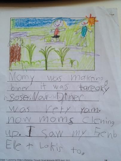 I will miss the days of deciphering words… I mentioned on FB a while back how often M refers to meals in conversation and in her “writing moments” activities. See if you can tell what was for dinner that was “yam.”