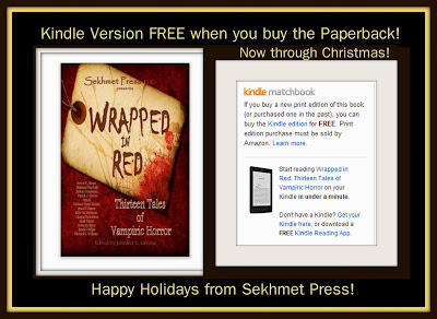 Well, terrible pun aside, from now until Christmas, you can pick up a copy of the Amazon paperback version of Wrapped in Red (featuring 13 vampire stories, including one by yours truly), and get the Kindle version for free.
