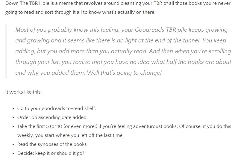 Go to your goodreads to-read shelf.Order on ascending date added.Take the first 5 (or 10 (or even more!) if you’re feeling adventurous) books. Of course if you do this weekly, you start where you left off the last time.Read the synopses of the bo...