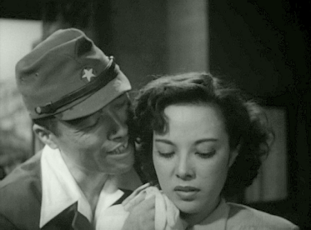 I’ve read elsewherethat it was also the first post-war Japanese film to feature scenes of Japanese soldierson the frontlines. In any case, while it’s certainly a compromised vision, thefilm is at least very well-made and often technically impressive, with cinematographerAkira Mimura winning a Mainichi Film Concours award for his efforts. On theother hand, the essentially simple story of a predictably doomed romance feelsoverstretched at almost two hours. As Lieutenant Narita and his men are stationed in the desert, thefilm is very much like a Japanese Foreign Legion movie, and memories of MarleneDietrich and Gary Cooper in Morocco(1930) are often brought to mind. There are some surprisingly sensual scenes betweenstars Yoshiko Yamaguchi and Ryo Ikebe – at one point, she bites his hand hardenough to draw blood, then sucks the wound, which he seems to enjoy. This wouldhave been considered strong stuff in Japan in 1950 and probably helped at thebox office.