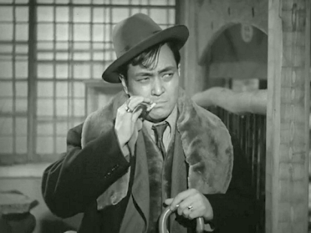 This Toho production* was based on a 1947 novel entitled Nishin ryoba (‘Herring Fishing Grounds’)by Tokuzo Kajino (1901-84, sometimes incorrectly listed as ‘Keizo Kajino’ or‘Shinzo Kajino’). The screenplay was co-written by the director, SenkichiTaniguchi, and Akira Kurosawa, with whom Taniguchi frequently collaborated duringthis stage in their careers, and its full of characteristic Kurosawa touches. Onesuch is when Kyubei’s son-in-law (Kurosawa favourite Kamatari Fujiwara), anapparently slow-witted clerk given to hiccups and sneezing, plays the shakuhachi (bamboo flute) and moveseveryone to tears, instantly clearing up the mystery of what his wife (NijikoKiyokawa) sees in him. Indeed, the script seems to have been largely the workof Kurosawa, with Taniguchi making some changes when he came aboard asdirector, and Kurosawa apparently brought the characters of Jakoman and Tetsuto the fore for the film, whereas the source novel had Kyubei as its mainprotagonist. Concerning Taniguchi, it’shard to take him very seriously as a director given the hokum that he made inthe final years of his career, while the fact that so many of his other films are basicallyinaccessible means that he’s likely to be forever regarded as a footnote toKurosawa (who was said to have done much of the editing on Taniguchi’s earlyfilms).