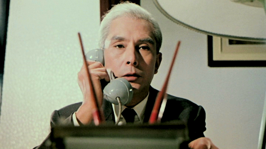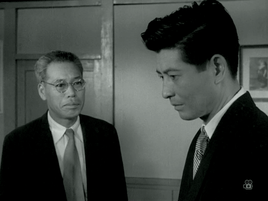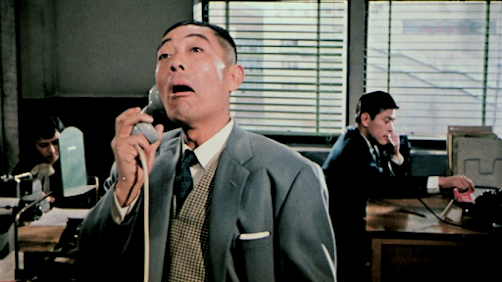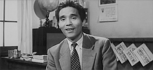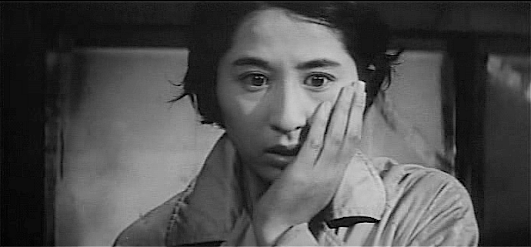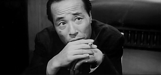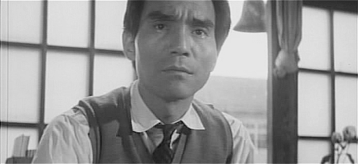 In the latter half ofthe film, Hitomi Nozoe has an important part as Kosaka’s sister. Any appearanceby Nozoe is welcome in my view as she was an underrated actor, and herbrilliant comic performance in Masumura’s Giantsand Toys made that movie (and as we can see here, there was nothing wrongwith her teeth!). Another actor who makes an impression is Kyu Sazanka, who usesevery trick in the book to steal all of his scenes as Uoza’s boss.