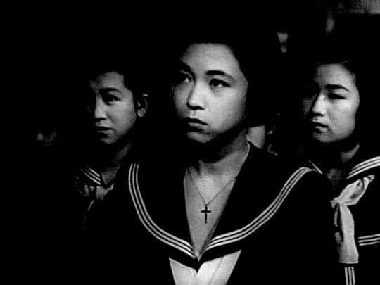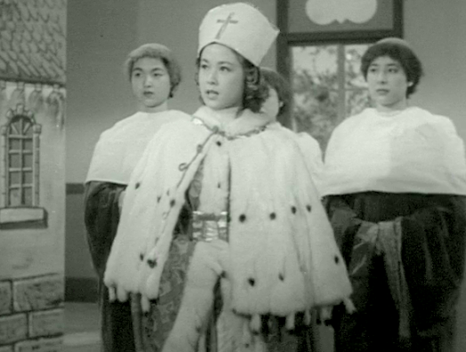 This is a slightimprovement on Judai no seiten asit’s not quite as risible despite some daft moments. Director Koji Shima hasbeen replaced by the younger Kozo Saeki (1912-72), who also made The Girl Who Tamed Beasts. At first, Ithought that the Christian propaganda featured in the first film had been scrappeduntil I noticed that Michiko Saga (in one of her first film appearances, here playinganother classmate of Akiko’s) was wearing a crucifix, and then Ayako Wakaoappeared playing a bishop in the school’s Joan of Arc play. I’m unsure how toaccount for the Christian theme, but perhaps screenwriter Katsuya Susaki orproducer Itsuo Doi (both of whom worked on all four films in this series) wereChristians, or perhaps it was normal during this period for reasonably wealthyJapanese families to send their daughters to Catholic schools. In any case,although we may laugh at certain aspects of these movies today, it’s notdifficult to see how they might have served a valuable function at the time inencouraging discussion of awkward subjects.