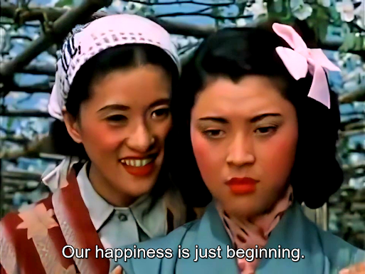 Despite itsquestionable ideology, Girls in theOrchard is not without its charms, and most of the characters – which alsoinclude Eijiro Tono as a drunken uncle – are likeable and easy to care about.The success of the colour process is difficult to judge given the poor qualityof the copy I watched, but it’s certainly not one of the more subtle uses ofcolour I’ve seen.