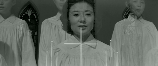 This is an ensemblepiece with no real stars, but among the characters whose destinies we followare a young reporter, Masaki (Tatsuo Umemiya), and his girlfriend, Tomoko(Yoshiko Mita), who works as a nurse, together with high school students Mie (Yukiko Nikaido) and Shigeo (Norifumi Fujishima), his sister Shizuko (Yayoi Furusato) and father (Yoshi Kato), and musician Tonomura(Junji Masuda) and his sick wife, Keiko (Michiko Hoshi). The ending of the filmfeatures another scene inside a Christian church in which Keiko is singing ahymn along with the rest of the congregation, but I’m at a loss to account forthis film’s emphasis on Christianity. Perhaps the director was a Christian, or maybe they thought it would help distribution abroad. In any case, the acting is generally good, with MichikoHoshi being a stand-out.