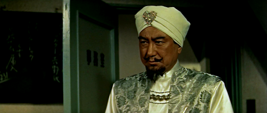 Outside of Japan,Chiezo Kataoka is perhaps best-known for his leading roles in a number of TomuUchida films, the most widely-seen of which is probably Bloody Spear at Mount Fuji, though he also played the nihilisticsamurai Ryunosuke Tsukue in Uchida’s three-film version of the novel Daibosatsu Toge – a character laterimmortalised by Tatsuya Nakadai in Swordof Doom. He was a wonderfully versatile actor as we can see from hisperformance (or performances) in ThirteenDemon Lords. Although the disguises that his character adopts (an Indianmagician, a beatnik artist, etc) are often utterly ridiculous, the extent to which Kataoka not onlychanges his appearance, but subtly alters his voice and body language each time is impressive.If it’s not too confusing, it should perhaps be noted that the character ofTarao Bannai himself is actually another alter-ego – the ‘real’ person behindthe different faces is one Daizo Fujimura, a former jewel thief who has turned hisback on his criminal past to become a crusader for justice.