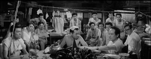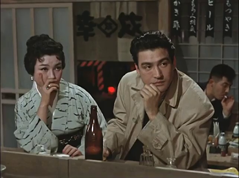 Like the previously-reviewed Beauty is Guilty, Night Butterflies was based on a novel by Matsutaro Kawaguchiand adapted by Sumie Tanaka, although the two films seem to mark the extent of their collaborations. Director Kozaburo Yoshimura (1911-2000) was a well-respected filmmaker who specialised in drama but occasionally experimented with comedy, as in The Fellows Who Ate the Elephant (1947). An Osaka Story(1957) is perhaps the most impressive of his accessible films. While well-executed, Night Butterflies is interesting mainly for its story, subject matter and two female stars. Shot in academy ratio during the last days of that format in Japan before widescreen became standard, it left me feeling that the latter format usually makes for more arresting compositions even in dramas of this sort, despite Fritz Lang’s famous apocryphal quote that Cinemascope was only good for photographing funerals and snakes. If Yoshimura’s film had been shot in widescreen, it would closely resemble the work of fellow Daiei director Yasuzo Masumura, especially in its misanthropic outlook (although a Masumura version would probably have featured Shuji slapping the girls around and taking advantage of them).
