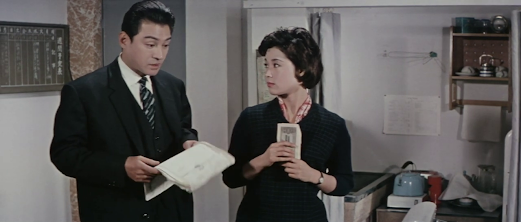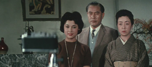 There’s not much of a role for Ayako Wakao in her third film for director Yasuzo Masumura. She appears (rather than ‘stars’) as Takako, the carefree daughter of Sahei Sanada (Shin Saburi), an employee who invents a new type of adhesive, as a result of which he is promoted to a highly-paid and important position. This newfound success leads to the reappearance of his former mistress, Sachiko (Sachiko Hidari), who has a young son she claims is his, while a student, Tanemura (Keizo Kawasaki), attempts to ingratiate himself with Sanada in order to pitch his own ideas to the company. Sanada resumes his affair with Sachiko, Tanemura begins one with Takako in order to strengthen his position, and Sanada’s wife, Fumiko (Sadako Sawamura), makes a fool of herself in a liaison with her daughter’s opportunistic piano teacher (Eiji Funakoshi).
