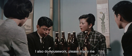 Unfortunately, the story is far from compelling as it’s obvious from the start that Kyoko and Saburo will end up marrying. Masumura works hard to maintain interest in the paper-thin material, throwing in some amusing comic vignettes featuring random characters such as a Jackson Pollock-inspired performance calligrapher and a schoolgirl singing a jazz number in a deep, masculine voice. However, despite his inventiveness, The Most Valuable Wiferemains a well-made film of little consequence.