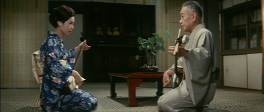 Director Tomotaka Tasaka indulges in some interesting flourishes, at times showing us what his characters are imagining. The most striking example of this is an all-yellow sequence illustrating a fantasy playing out in Monzaemon’s head, while when he improvises a song inspired by Saku, Tasaka cuts to an elaborate montage of flowers and silk-spinning.