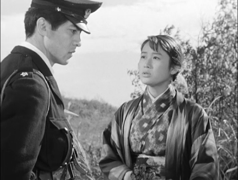 Rentaro Mikuni, star of my previous post’s film, appears here on the other side of the law, but in a smaller role, as this Nikkatsu production is an ensemble piece featuring a cast of well-known actors, each of whom has limited screen time. Here, Mikuni is a naïve country policeman who falls for a young woman (Kaneko Iwasaki) he rescues from the clutches of a people trafficker played by Haruko Sugimura.
