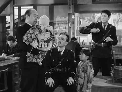 Masao Mishima plays Mikuni’s boss, while Taiji Tonoyama and Hisaya Morishige appear as his colleagues. In this world, a long way from the yakuza and seedy bars of Tokyo, the cops are all good-natured types who prefer to help people rather than lock them up. The strand which receives the most attention focuses on Police Sergeant Yoshii (Morishige); lumbered with a young girl and her baby brother who have been abandoned on a train by their mother, he finds a temporary home for the baby and takes the girl into his own house as he already has five kids and figures one more will make no difference.