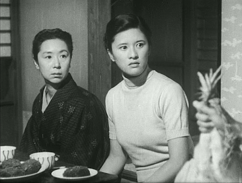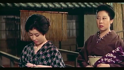 Weirdly, it turns out tobe Isuzu Yamada who gets to sing a song here, which she does while accompanyingherself on the shamisen. She alsogives what’s easily the best performance in the film as Hibari’s widowedfather’s forthright and not-to-be-messed-with mistress, who at one pointactually attacks Hibari's dad for discouraging his daughter from marrying the oneshe loves. In my view, Yamada was the most versatile character actress inJapanese cinema and the shortcomings of the leads are even more obvious incontrast with her remarkable talents. If she’d had a larger role, I’d recommendwatching the film for Yamada alone, but her screen time’s quite limited, soit’s probably not worth suffering through the misguided star pairing of Hibariand Tsuruta, which is to this film what that big lump of ice was to the Titanic. In terms of So Yamamura films,this one’s just… so-so (sorry!).