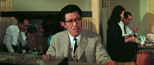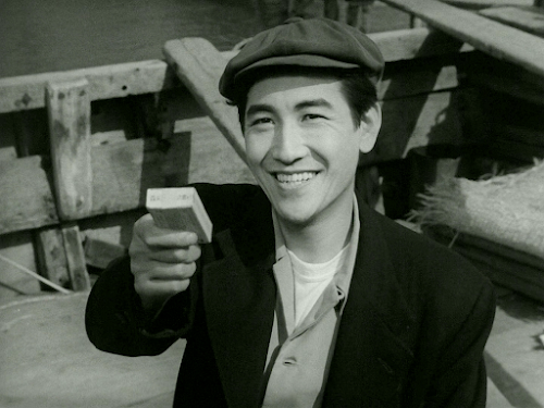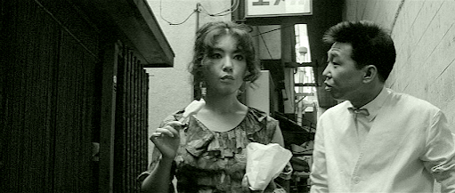 It’s unusual to see a character like Hidaka as the protagonist ofa movie. The fact that he’s played by Hisaya Morishige led me to expect acomedy, but I think this is supposedto be a drama, toothless as it may be. Morishige is an actor little-known abroad,but who played leads for director Shiro Toyoda in Marital Relations (1955) and Shozo,A Cat and Two Women (1956). Hidaka is a character who undergoes a complete,almost Scrooge-like transformation by the end of the film. The problem is thatnone of it is at all convincing. We are in some weird kind ofmale-wish-fulfilment fantasy land here with the vivacious Reiko Danas a highly unlikely streetwalker. It’s not Dan’s fault, though, it’s just awhitewashed portrait of someone reduced to this profession – the contrast withMiyuki Kuwano in the same year’s TheShape of Night could not be more pronounced.