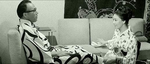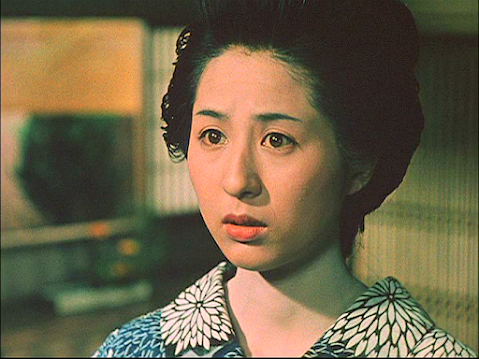 For the most part, MasashigeNarusawa’s screenplay(s) could be taken as a model of how to adapt literaturefor the cinema, but there’s one part of the story that bothers me in both films– while Suezo is away for a day, Otama gives her maid the day off and sets about preparing an elaborate meal for Okada,intending to invite him into her home as he passes by so they can finally be alone together. This seems stupid considering thatshe has no idea if he will be available, or even accept if he is. And it just doesn't seem like something a woman in her situation would do because, if he did accept, somebody would be sure to find out about it and the two would become the subject of a scandal which would do neither of them any good. This absurdityis an invention of Narusawa’s as, in the book, she simply goes to thehairdresser and intends to start a conversation with him when she sees him coming rather than simply exchanging a silent greeting as they usually do.
